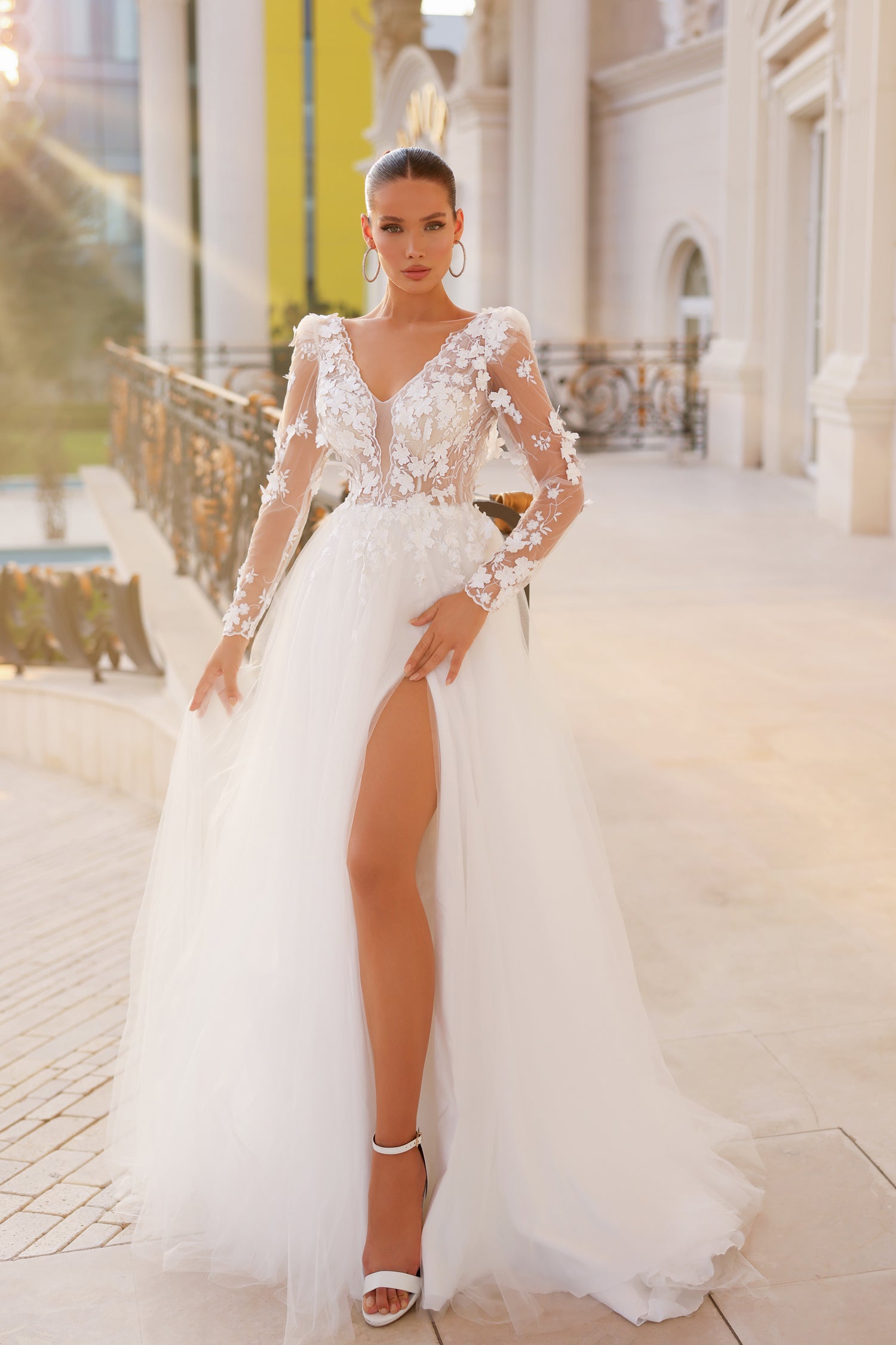 A gorgeous mermaid gown with sprinkle glitter featuring a deep V neckline and low back with side split. This gown is finished with a ruffle detailing that flows to the back. Mermaid/Fishtail Gown Ruffle front Side split Glitter fab