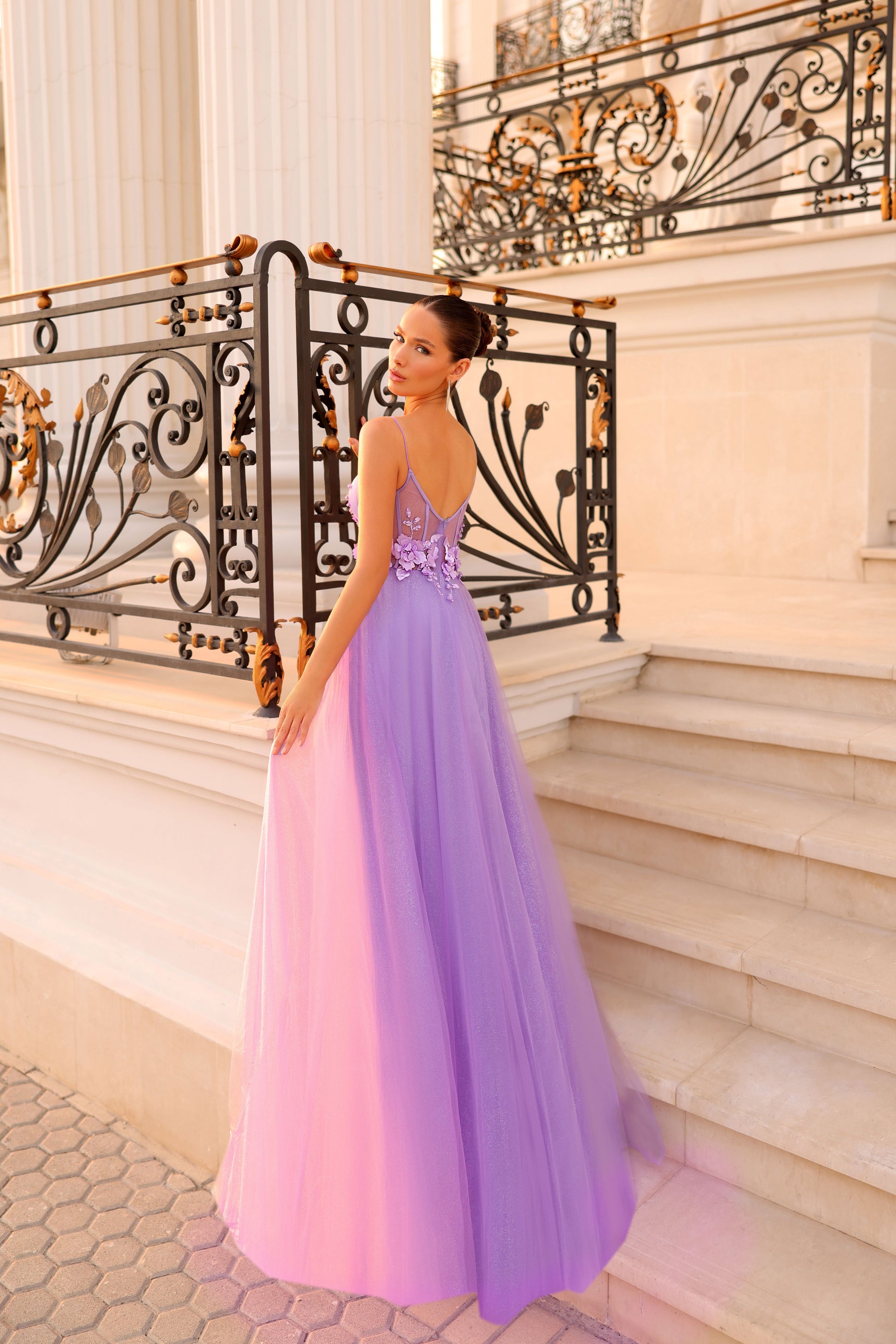 The Lea TE218 Formal Dress features a corset boned bodice, adjustable spaghetti straps, and 3D floral details encircling the waist. The flowy glitter tulle skirt adds a touch of sparkle to complete the fairytale aesthetic.