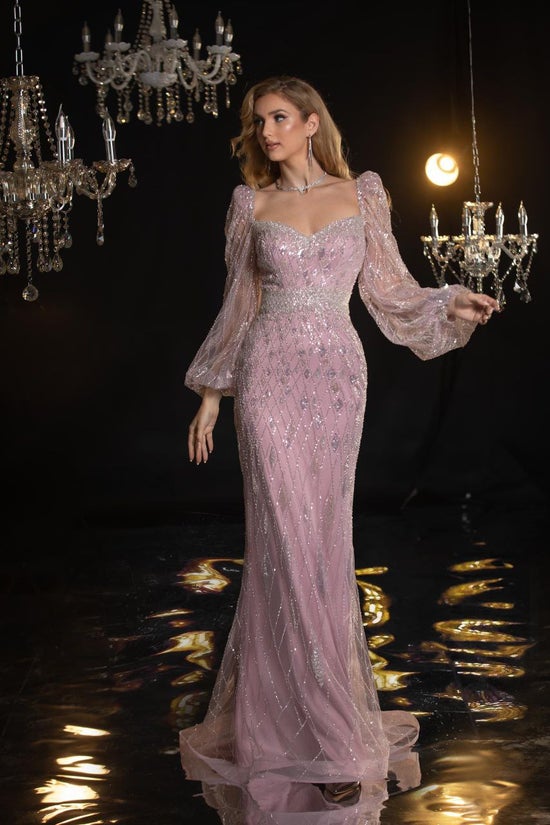 Stunning mermaid gown featuring hand-sewn sparkling gemstones throughout. This haute couture piece showcases a flattering silhouette that curves elegantly before cascading to the floor. Meticulously crafted with premium materials, each gemstone is positioned to shimmer and dazzle under any light. Ideal for formal occasions, red carpet events, and memorable celebrations. Pure sophistication and glamour combined.